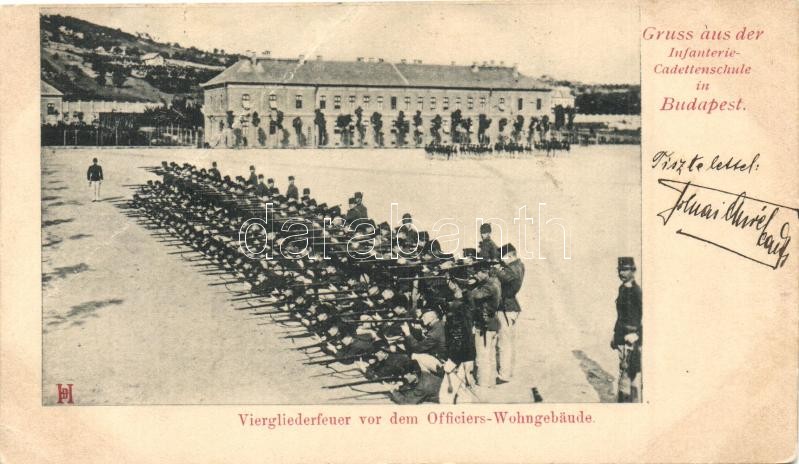 Budapest II. Lipótmező, Hidegkúti út. Cs. és Kir. gyalogsági hadapród iskola, tüzelés, lőgyakorlat a tiszti lakóépület előtt / K.u.K. Infanterie-Cadetten-Schule, Viergliederfeuer vor dem Officers-Wohngebäude (EB)