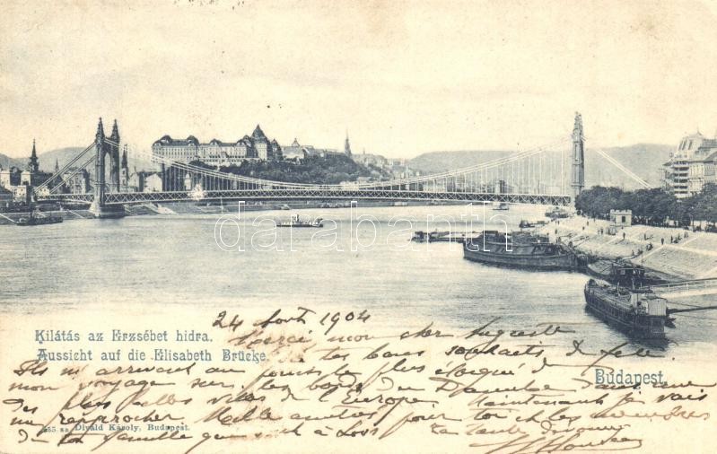 Beschreibung: Budapest, Kilátás az Erzsébet hídra, uszályok, Divald Károly 555. sz. (EK)