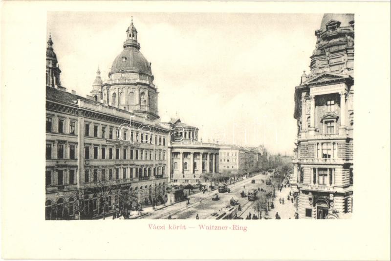 Beschreibung: Budapest V. Váci körút, Pollak Testvérek üzlete, villamosok, Fuvarleveleket felülvizsgáló iroda (non PC) (EK)