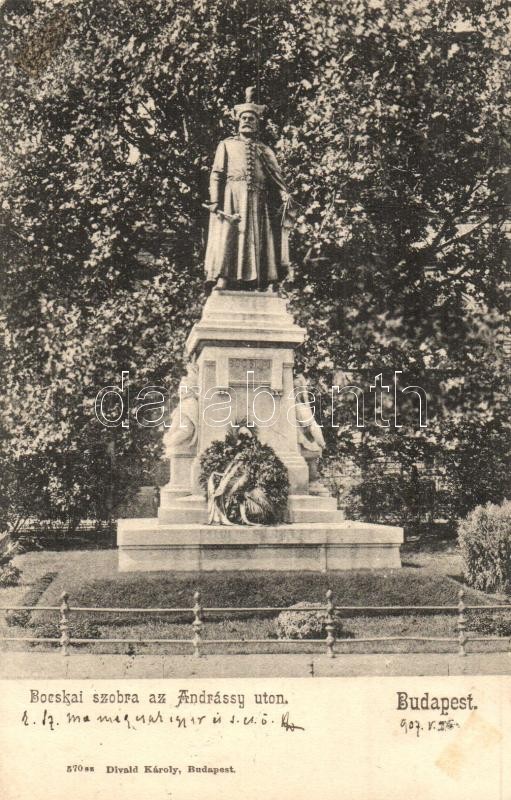 Budapest VI. Andrássy út, Bocskai szobor, Divald Károly 570. sz. (fa) https://www.darabanth.com/de/297-Fernauktion/297.0/Ansichtskarten/Ungarn~7/Budapest-VI-Andrassy-ut-Bocskai-szobor-Divald-Karoly-570-sz-fa~II1589186