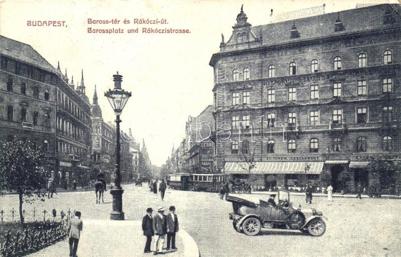 Beschreibung: Budapest VII. Baross tér és Rákóczi út, villamos, Központi szálloda, étterem és kávéház, automobil (EK)