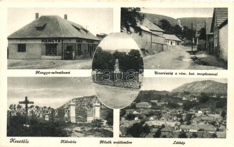 Beschreibung: Kesztölc, Hangya szövetkezet, utca, Hősök emlékműve, kálvária