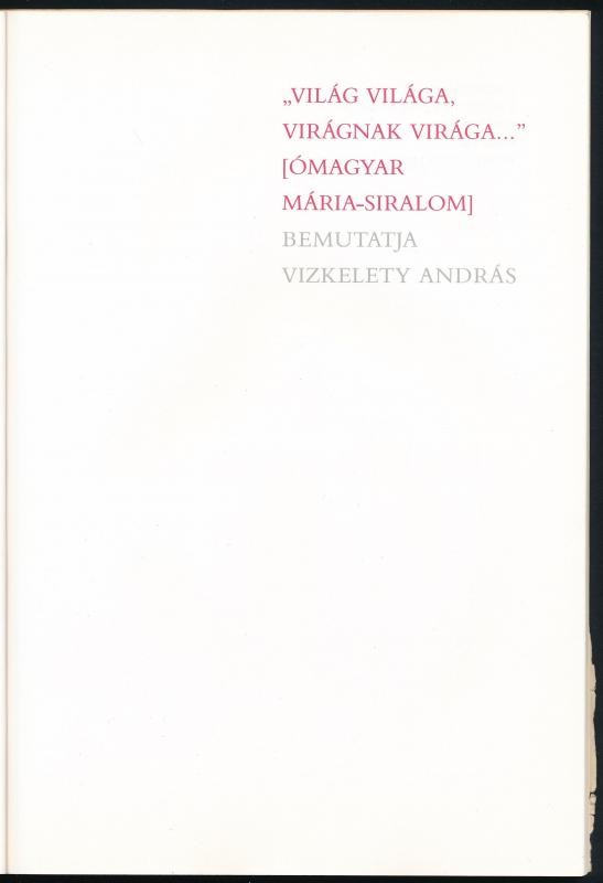 Beschreibung: "Világ világa, virágnak virága..." [Ómagyar Mária-siralom.] Bp., 1986, Európa. Kiadói papírkötés.