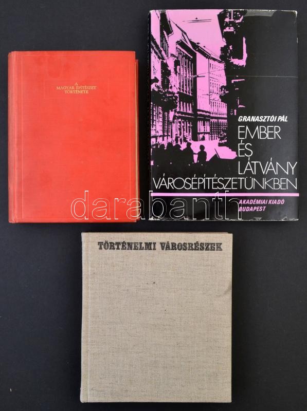 Vegyes építészeti témájú könyv, 3 db: Granasztói Pál: Ember és látvány városépítészetünkben. Bp., 1972, Akadémiai Kiadó. Kiadói egészvászon kötés, jó állapotban. Gerő László: Történelmi városrészek. Bp., 1971, Műszaki Könyvkiadó. Kiadói vászonkötés, jó állapotban. Bierbauer Virgil: A magyar építészet története.Bp., é.n., Magyar Szemle Társaság. Kiadói egészvászon kötésben.