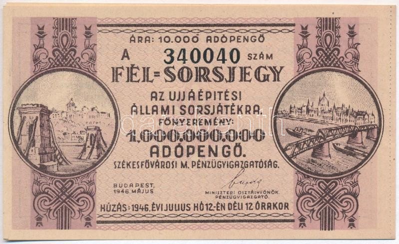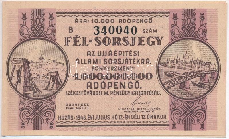 1946. "Fél-sorsjegy az Újjáépítési Állami Sorsjátékra" fél sorsjegy 1... https://www.darabanth.com/de/297-Fernauktion/297.0/Numismatik/Aktien-und-Tickets~500005/1946-Fel-sorsjegy-az-Ujjaepitesi-Allami-Sorsjatekra-fel-sorsjegy-10000AP-ertekben-~II1585894