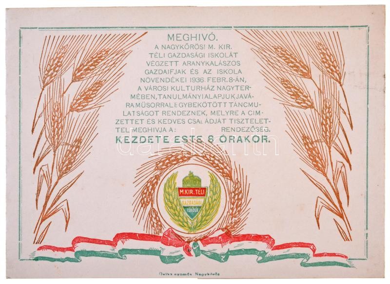 ~1930. "Magyar Királyi Téli Gazda Tanfolyam" zománcozott fém jelvény, mellette a "Nagykőrösi M. Kir. Téli Gazdasági Iskola" meghívója rendezvényre (25x45mm) T:2