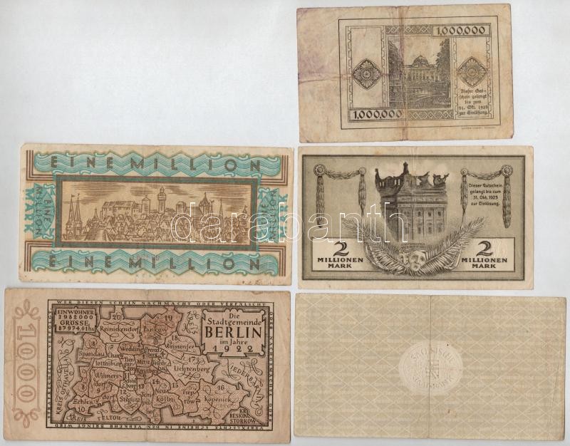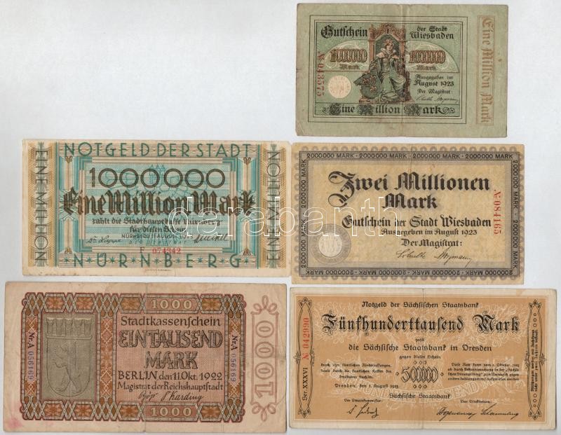Németország / Weimari Köztársaság 1922-1923. 5db-os szükségpénz tétel, helyi kiadások Drezda, Wiesbaden, Nürnberg, Berlin T:III,III- Germany / Weimar Republic 1922-1953. 5pcs of necessity notes, local issues from Dresden, Wiesbaden, Nüremberg, Berlin C:F,VG