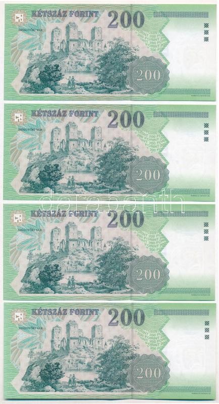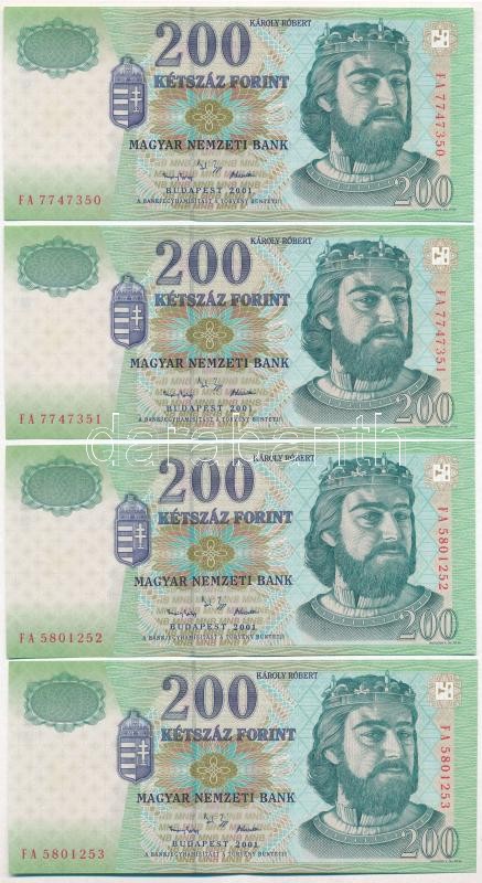 2001. 200Ft (4x) sorszámkövetők, "FA 5801253 - FA 5801253" T:II https://www.darabanth.com/de/297-Fernauktion/297.0/Numismatik/Ungarische-Banknoten~500007/2001-200Ft-4x-sorszamkovetok-FA-5801253--FA-5801253-TII~II1582250