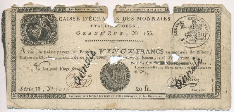 Beschreibung: Franciaország / Rouen 1797-1803. 20Fr "annulé (érvénytelen)" felülbélyegzéssel T:IV France / Rouen 1797-1803. 20 Francs "annulé (cancelled)" C:G Krause S245a