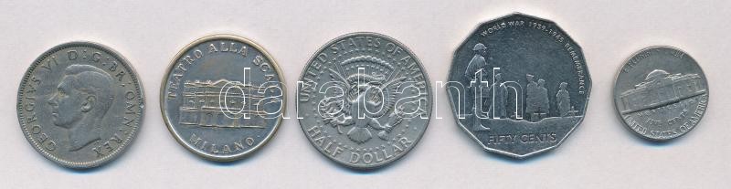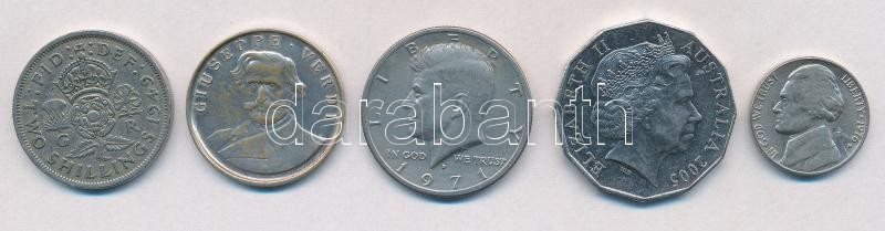Vegyes: Ausztrália 2005. 50c Cu-Ni "II. Világháború megemlékezés" + Amerikai Egyesült Államok 1976. 5c Cu-Ni "Monticello" + 1967. 1/2$ Cu-Ni "Kennedy" + Nagy-Britannia 1949. 2Sh Cu-Ni "VI. György" + Olaszország DN "Giuseppe Verdi / Milano" fém emlékérem (28mm) T:2 Mixed: Australia 2005. 50 Cents Cu-Ni "World War 1939-1945 Remembrance" + USA 1976. 5 Cents Cu-Ni "Monticello" + 1967. 1/2 Dollar Cu-Ni "Kennedy" + Great Britain 1949. 2 Shillings Cu-Ni "George VI" + Italy ND "Giuseppe Verdi / Milano" metal commemorative medal (28mm) C:XF