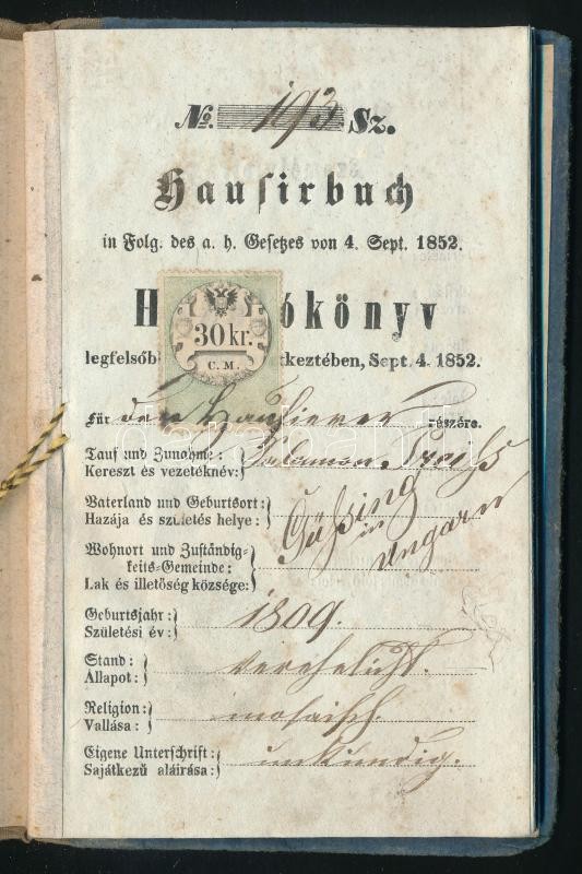 Beschreibung: 1852 Házalókönyv németújvári lakos részére tele bejygzéssel / Peddler passport