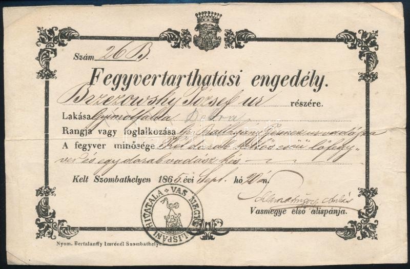 1865 Fegyvertarthatási / fegyvertartási engedély dobrai lakos, Batthyá... https://www.darabanth.com/de/298-Fernauktion/298.0/Andere-Sammelgebiete/Dokument~100016/1865-Fegyvertarthatasi-fegyvertartasi-engedely-dobrai-lakos-Batthyanyi-Ferenc-vadasza-reszC3~II1592708
