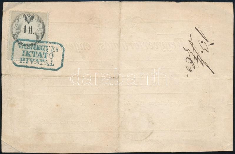 Beschreibung: 1865 Fegyvertarthatási / fegyvertartási engedély dobrai lakos, Batthyányi Ferenc vadásza részére 1Fl illetékbélyeggel / 1865 Gun licence