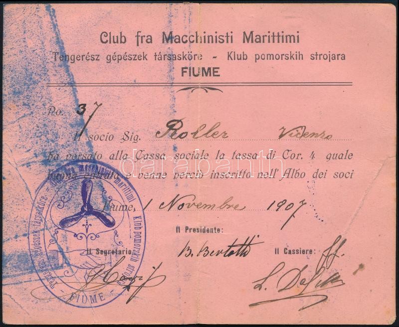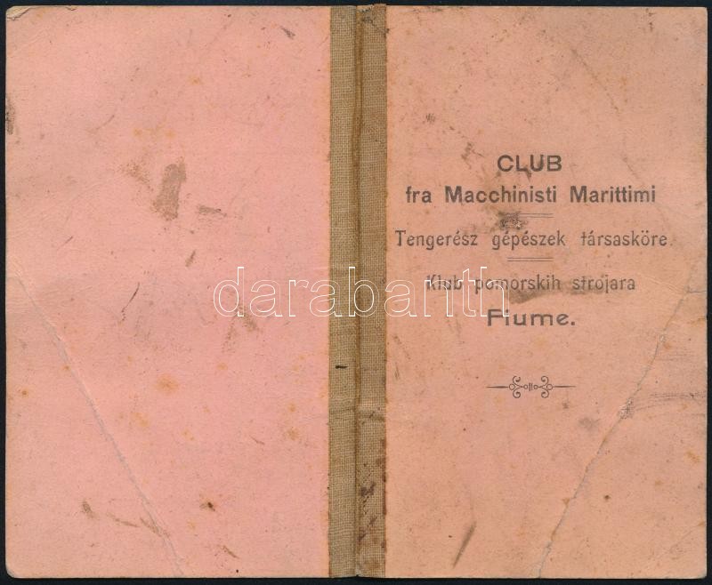 1907 Fiume, Tengerész gépészek társaskörének igazolványa / ID for sail... https://www.darabanth.com/de/298-Fernauktion/298.0/Andere-Sammelgebiete/Dokument~100016/1907-Fiume-Tengeresz-gepeszek-tarsaskorenek-igazolvanya-ID-for-sailor-enginers-associatio~II1594303