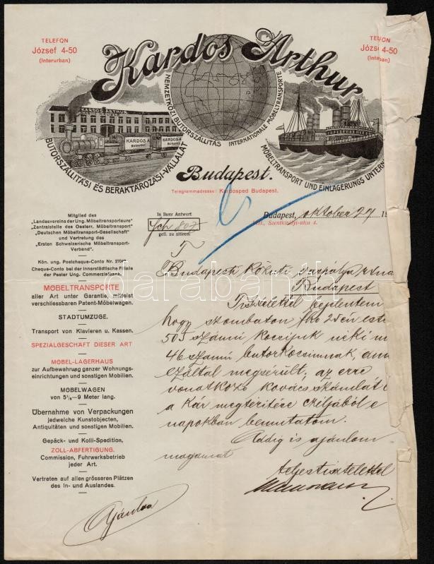 1913 Kardos Arthur Butorszállítási és Beraktározási-Vállalat levele, d... https://www.darabanth.com/de/298-Fernauktion/298.0/Andere-Sammelgebiete/Dokument~100016/1913-Kardos-Arthur-Butorszallitasi-es-Beraktarozasi-Vallalat-levele-diszes-fejleces-papir~II1595228