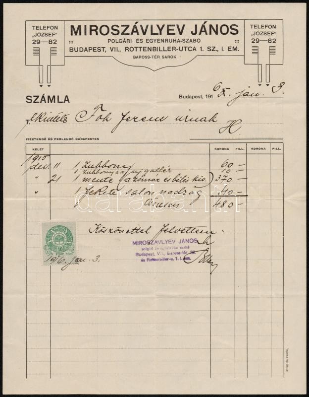 1916 Díszes fejlécű számla, Miroszávlyev János Polgári- és Egyenruha-S... https://www.darabanth.com/de/298-Fernauktion/298.0/Andere-Sammelgebiete/Dokument~100016/1916-Diszes-fejlecu-szamla-Miroszavlyev-Janos-Polgari-es-Egyenruha-Szabo-Bp-10-f-oma~II1595349