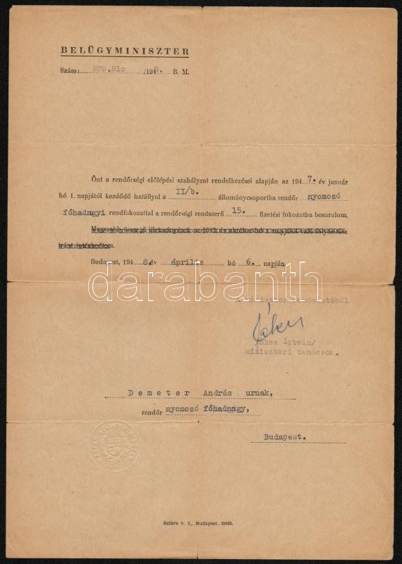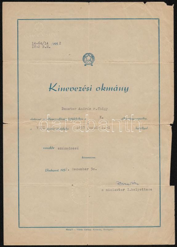 1920-1952 Rendőr főhadnagy kinevezési okmánya és egyéb iratai: vizsgab... https://www.darabanth.com/de/298-Fernauktion/298.0/Andere-Sammelgebiete/Dokument~100016/1920-1952-Rendor-fohadnagy-kinevezesi-okmanya-es-egyeb-iratai-vizsgabizonyitvany-kimarada~II1591129