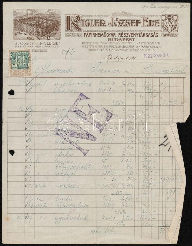 1922 Díszes fejléces számla, Rigler József Ede Papirnemügyár Rt., Bp.,... https://www.darabanth.com/de/298-Fernauktion/298.0/Andere-Sammelgebiete/Dokument~100016/1922-Diszes-fejleces-szamla-Rigler-Jozsef-Ede-Papirnemugyar-Rt-Bp-2-k-okmanybelyeggel-~II1595245