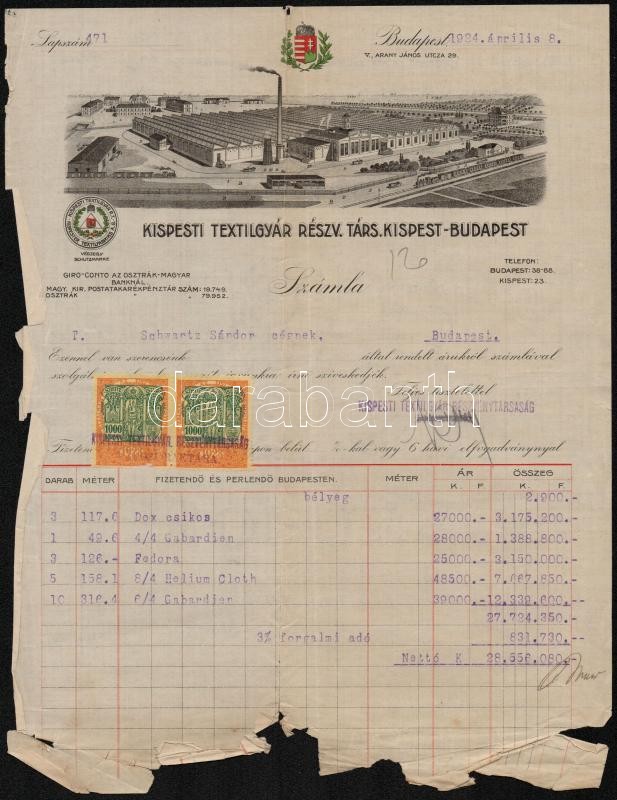 1924 Díszes fejlécű számla, Kispesti Textilgyár Rt., Bp., 2 db 1000 k.... https://www.darabanth.com/de/298-Fernauktion/298.0/Andere-Sammelgebiete/Dokument~100016/1924-Diszes-fejlecu-szamla-Kispesti-Textilgyar-Rt-Bp-2-db-1000-k-omanybelyeggel-szakad~II1595289