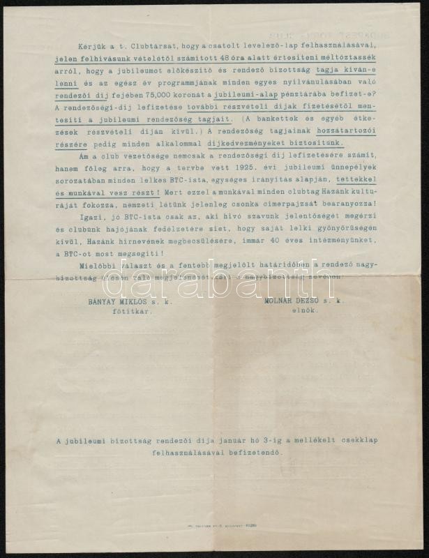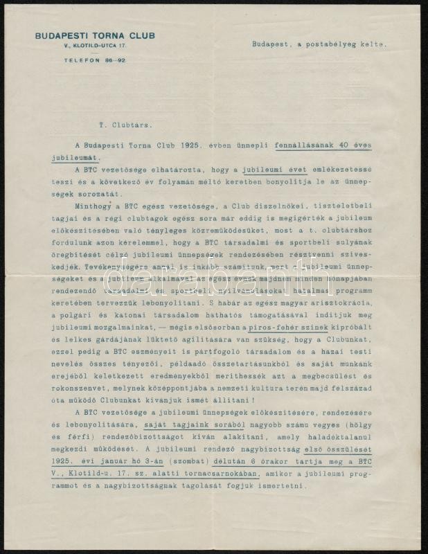 Beschreibung: 1925 a Budapesti Torna Club körlevele a jubileumi ünnepségekkel kapcsolatban