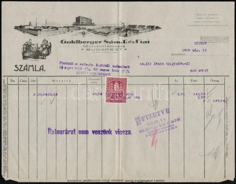 Beschreibung: 1929 Díszes fejlécű számla, Goldberger Sám. F. és Fiai Rt. Bp., 2 f. okmánybélyeggel.