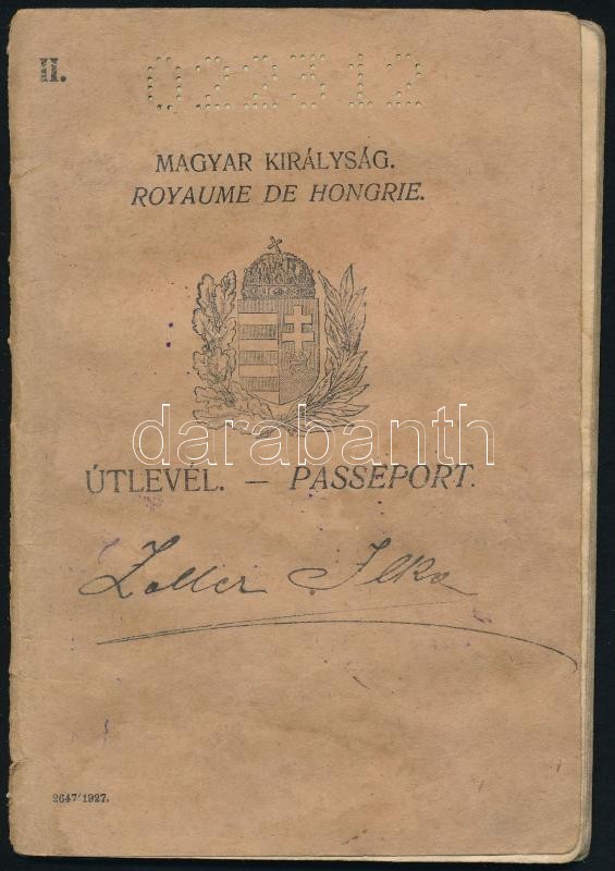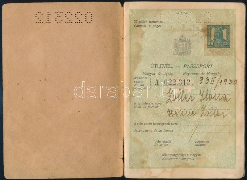 1932 Útlevél fénykép nélkül, foltos lapokkal https://www.darabanth.com/de/298-Fernauktion/298.0/Andere-Sammelgebiete/Dokument~100016/1932-Utlevel-fenykep-nelkul-foltos-lapokkal~II1594307