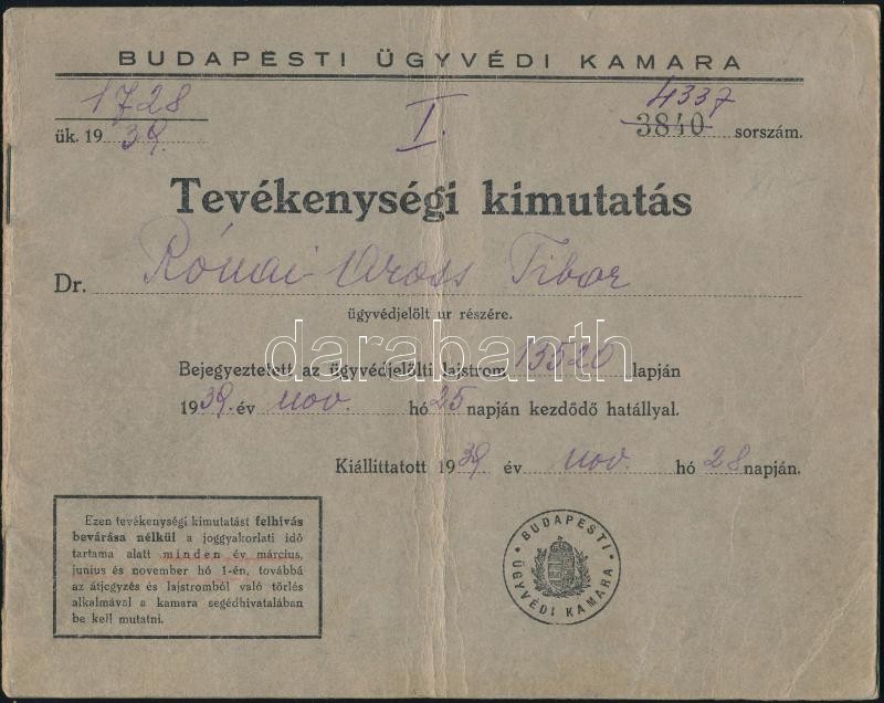 1939 Tevékenységi kimutatás Rónai-Aross Tibor ügyvédjelölt részére https://www.darabanth.com/de/298-Fernauktion/298.0/Andere-Sammelgebiete/Dokument~100016/1939-Tevekenysegi-kimutatas-Ronai-Aross-Tibor-ugyvedjelolt-reszere~II1592141