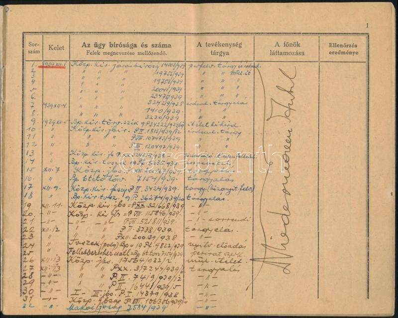 Beschreibung: 1939 Tevékenységi kimutatás Rónai-Aross Tibor ügyvédjelölt részére