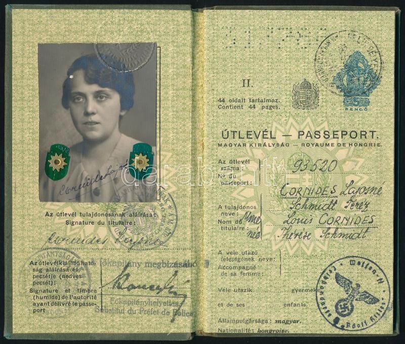 1942 Cornides Lajosné keménykötésű útlevele https://www.darabanth.com/de/298-Fernauktion/298.0/Andere-Sammelgebiete/Dokument~100016/1942-Cornides-Lajosne-kemenykotesu-utlevele~II1592423