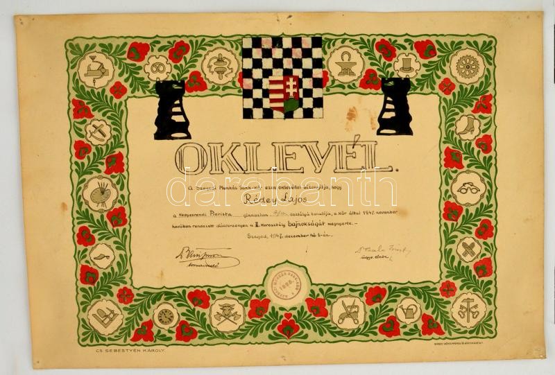 1947-1949 Sakk verseny I. és III. helyezetének járó díszoklevelek, pec... https://www.darabanth.com/de/298-Fernauktion/298.0/Andere-Sammelgebiete/Dokument~100016/1947-1949-Sakk-verseny-I-es-III-helyezetenek-jaro-diszoklevelek-pecsettel-alairassal~II1597307