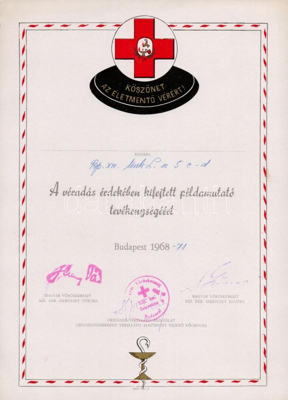 1968 a Vöröskereszt elismerő oklevele véradásért https://www.darabanth.com/de/298-Fernauktion/298.0/Andere-Sammelgebiete/Dokument~100016/1968-a-Voroskereszt-elismero-oklevele-veradasert~II1592148