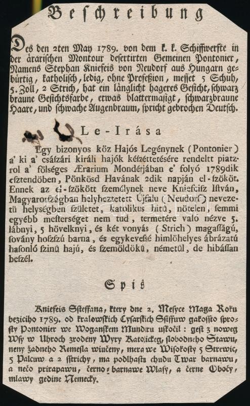 Beschreibung: 1789 Szökött hajóslegény körözvénye magyar nyelven, kivágáson