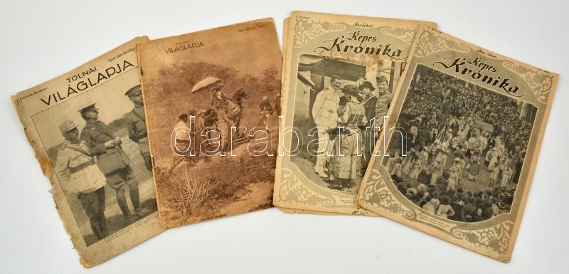 1919-1920 Vegyes folyóirat tétel, 4 db: Tolnai világlapja XIX. évf. 17.19. számok, Képes Krónika II. évf. 26-35. szám, szakadozott, viseltes állapotban.