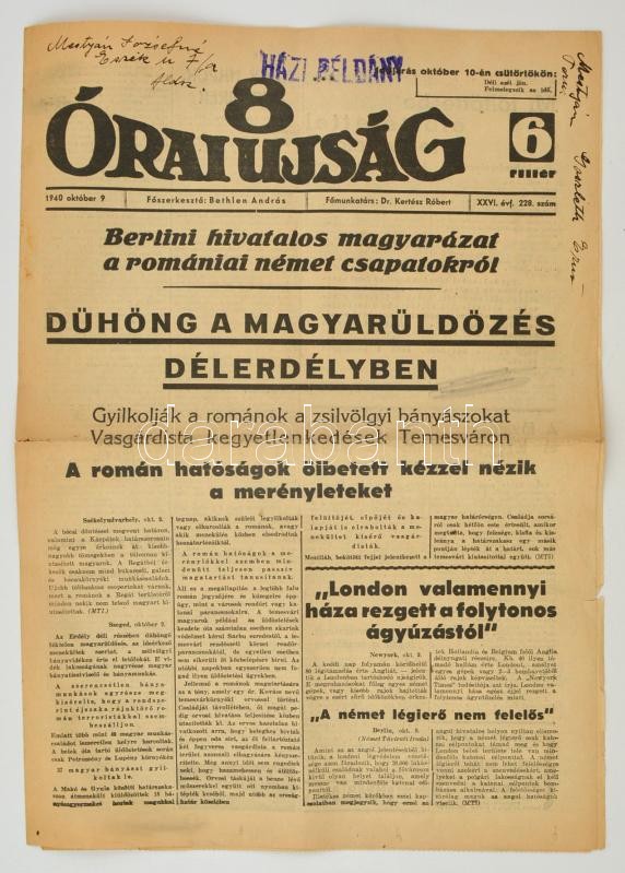 Beschreibung: 1940 A 8 Órai Újság XXVI. évfolyamának 228. száma, címlapon magyarüldözéssel kapcsolatos cikkel