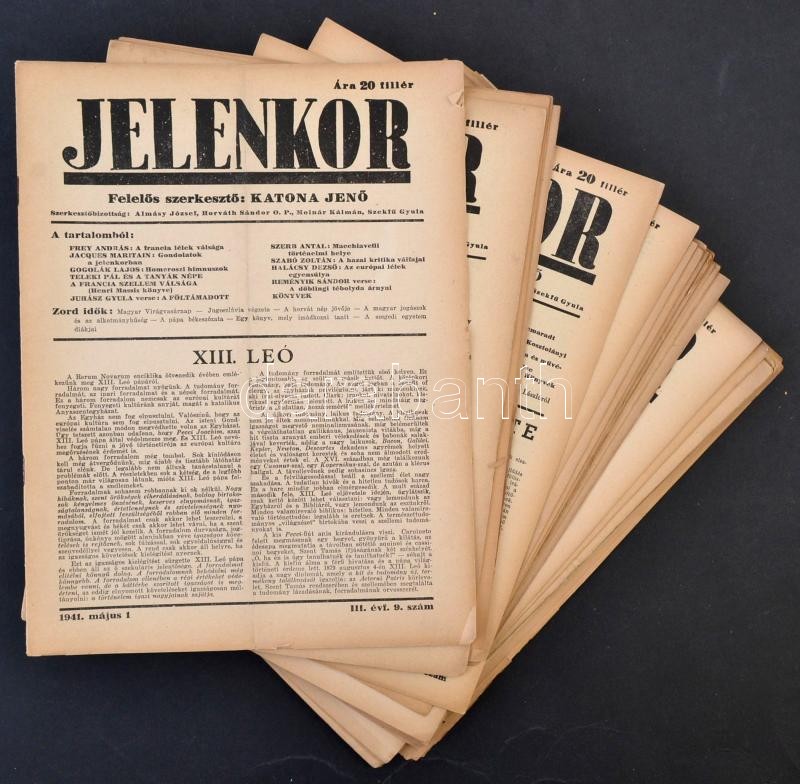 1941-1942 A Jelenkor c. folyóirat 23 db száma a kor szellemi életének ... https://www.darabanth.com/de/298-Fernauktion/298.0/Andere-Sammelgebiete/Drucksachen~100026/1941-1942-A-Jelenkor-c-folyoirat-23-db-szama-a-kor-szellemi-eletenek-lenyomataval~II1592483