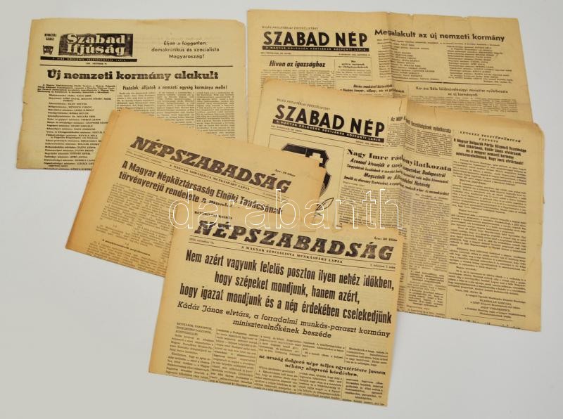 1956 Vegyes újság tétel, 5 db: Szabad Nép, október 28-29., XIV. évf. 297-298. számok, Szabad Ifjúság. október 27., Népszabadság november 12-22. számok, I. évf. 7.,15 számok, kissé szakadozott állapotban.