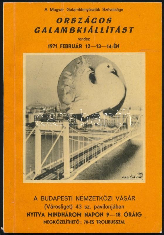 1971 Országos galambkiállítás. Budapest, 1971. február 12-14. Rendezi: Magyar Galambtenyésztők Szövetsége. Bp., Fővárosi Nyomdaipari Vállalat. Kiadói papírkötés, 45+7 p. Kiadták 1500 példányban.