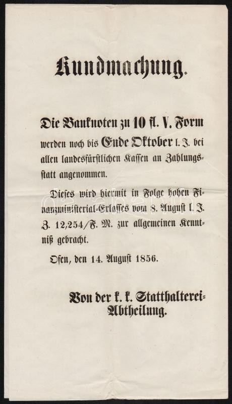 Buda 1856. "A császári királyi helytartósági osztály" által kiadott hirdetmény az "V. formáju 10 for." bankjegyek bevonásáról magyar és német nyelven Hungary / Buda 1856. Announcement about the involvement of the 10 Forint banknotes in 2 languages 44x40 cm