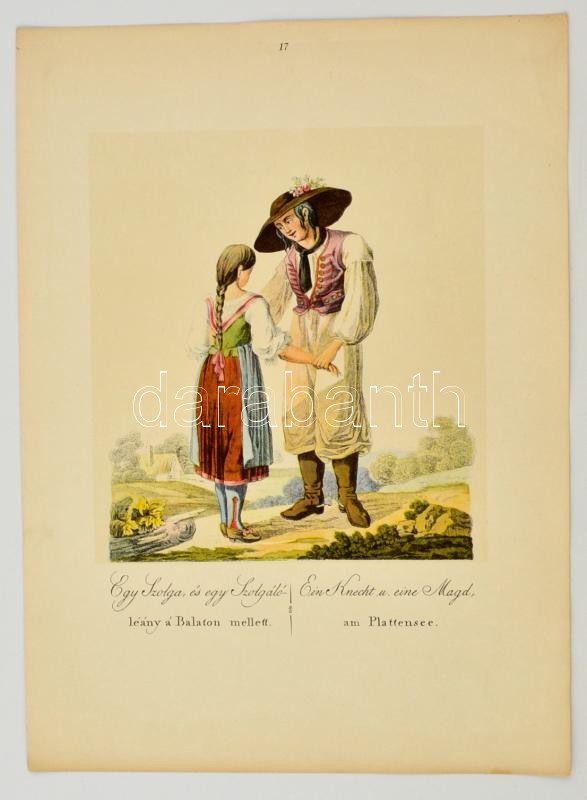 Egy szolga és egy szolgálóleány a Balaton mellett. Ein Knecht u. eine Magd am Plattensee. Kresz Mária: Magyar parasztviselet. Budapest, 1956, Akadémiai Kiadó, 17. tábla. Reprint kiadás, 33x24 cm.