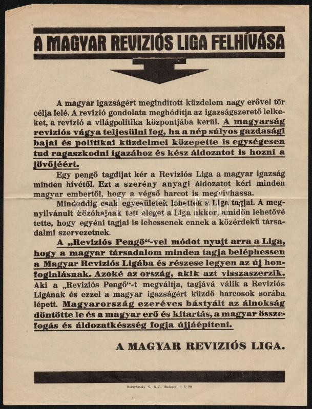 cca 1930 Revíziós tétel: A Revíziós liga felhívása Revíziós Pengő vált... https://www.darabanth.com/de/298-Fernauktion/298.0/Andere-Sammelgebiete/Drucksachen~100026/cca-1930-Revizios-tetel-A-Revizios-liga-felhivasa-Revizios-Pengo-valtasara-Hozza-egy~II1595449