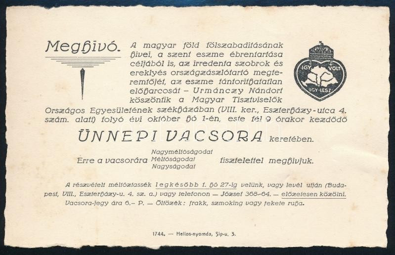 cca 1935 Ereklyés Országzászlótartó alkotójának díszvacsorájára szóló ... https://www.darabanth.com/de/298-Fernauktion/298.0/Andere-Sammelgebiete/Drucksachen~100026/cca-1935-Ereklyes-Orszagzaszlotarto-alkotojanak-diszvacsorajara-szolo-meghivo~II1597084