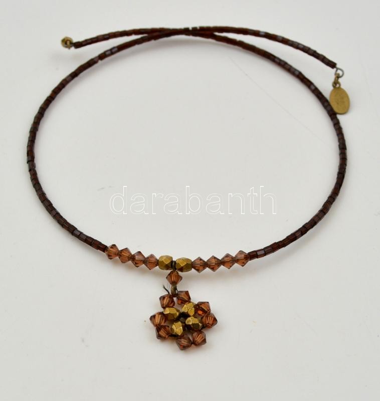 Beschreibung: Barna gyöngyökkel díszített nyaklánc, fűzött gyöngy medállal, d: 12 cm