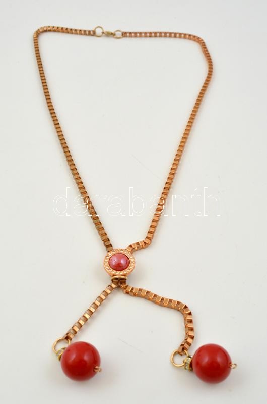 Beschreibung: Bordó gyöngyökkel díszített arany színű fém bizsu nyaklánc, h: 70 cm
