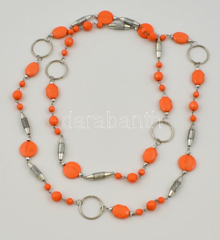 Beschreibung: Ezüst színű nagyméretű bizsu nyaklánc korallszínű műanyag gyöngyökkel, h: 70 cm