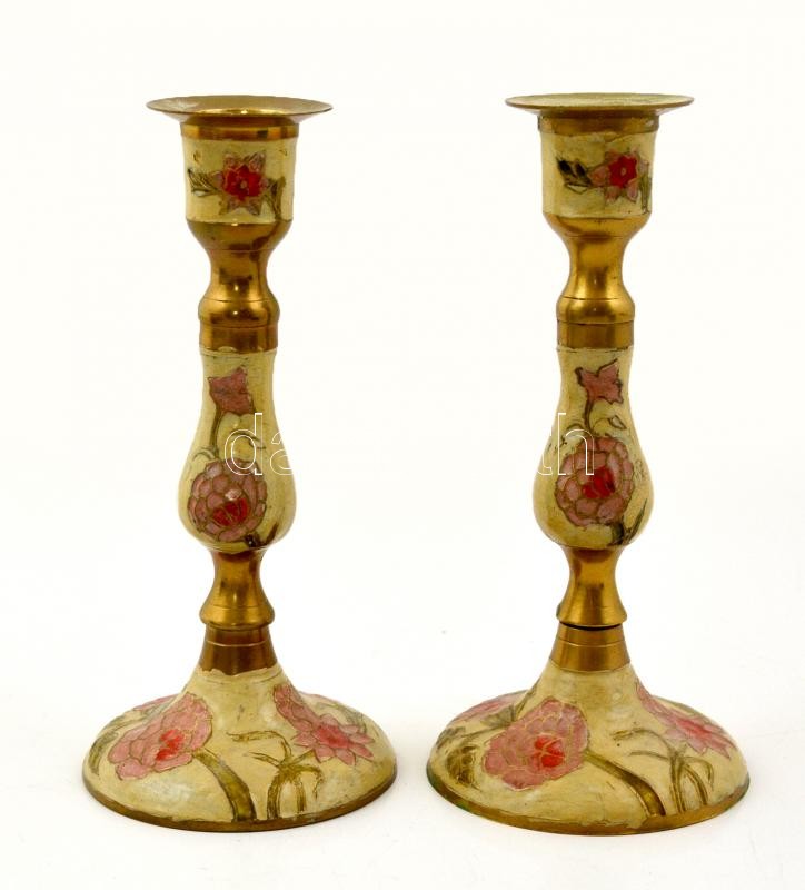 Beschreibung: Réz gyertyatartó pár zománc díszítéssel, apró zománc hibákkal, m:17 cm (2×)