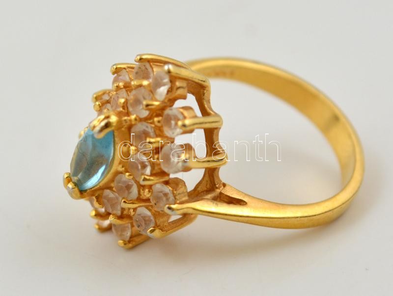 Beschreibung: Világoskék és áttetsző kövekkel díszített elegáns aranyszínű bizsugyűrű, méret: 52