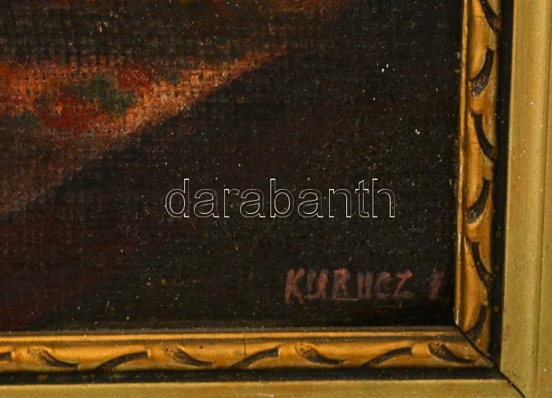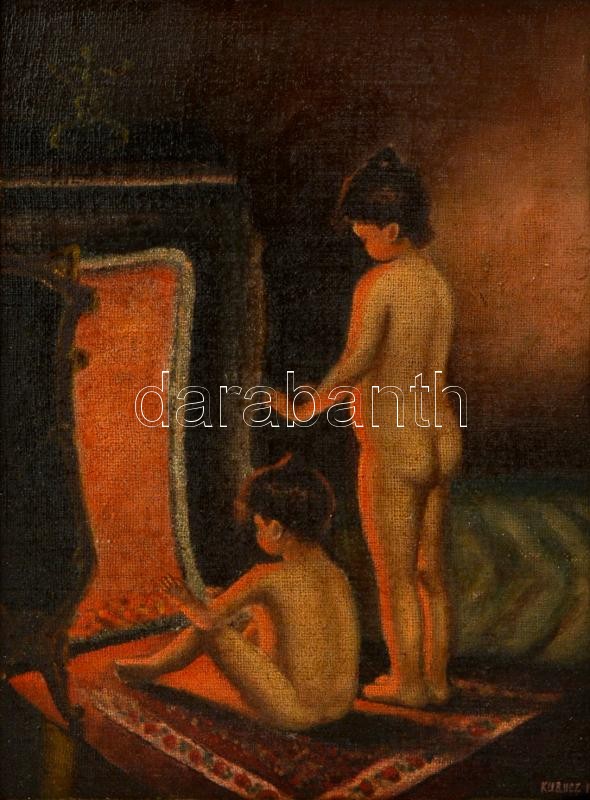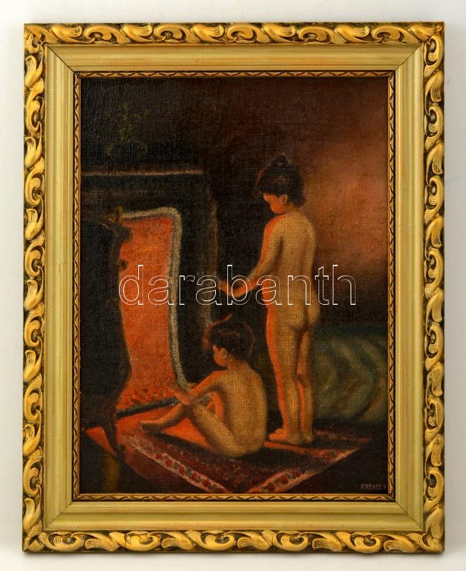 Beschreibung: Kurucz D. István (1914-1996): Fürdés után (Paul Peel festménye után). Olaj, karton, jelzett, keretben, 46×34 cm