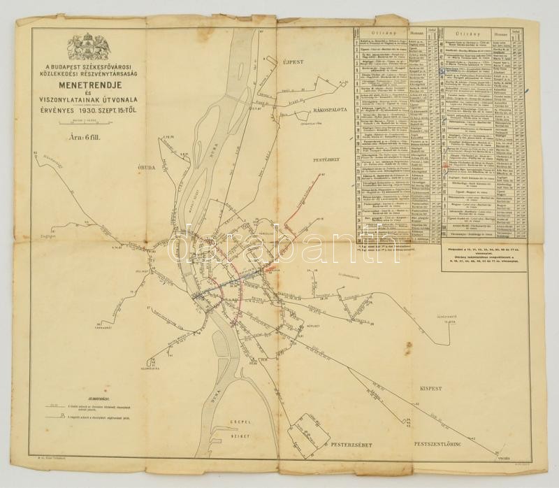 1930 A Budapest Székesfővárosi Közlekedési Részvénytársaság menetrendje és viszonylatainak útvonala, kiadja a M. kir. állami térképészet, hajtott, szakadással, 42x47 cm