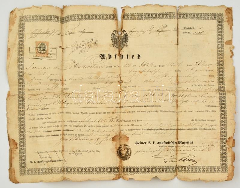 1866 Katonai végelbocsájtó levél (obsit) a cs. és kir. József főherceg 37. gyalogezredben szolgáló katona részére, ragasztott, viseltes állapotban, 38x49 cm