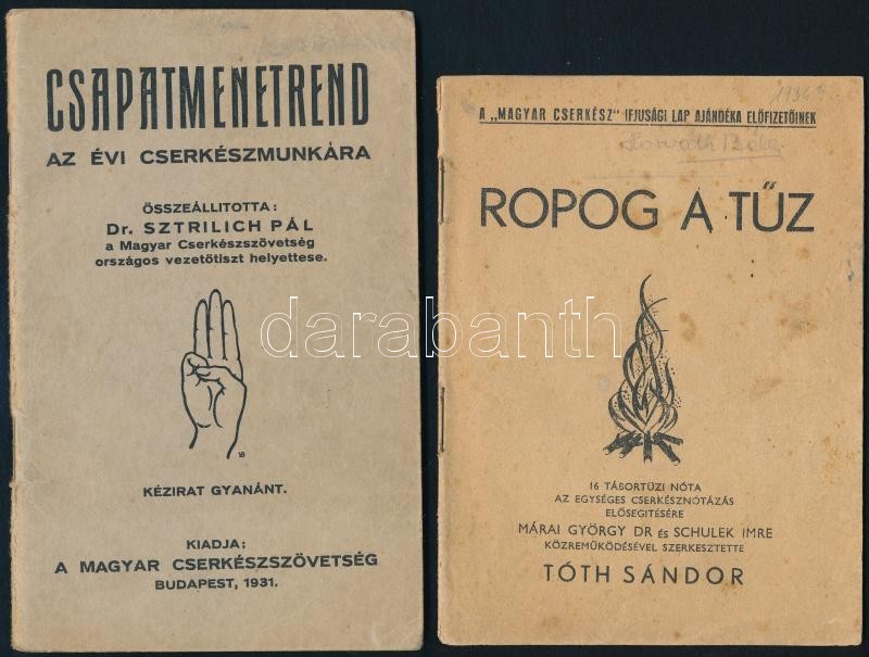cca 1930-1940 Cserkész iratok és kiadványok (Csapatmenetrend, 1933-as ... https://www.darabanth.com/de/298-Fernauktion/298.0/Andere-Sammelgebiete/Pfadfinder~100023/cca-1930-1940-Cserkesz-iratok-es-kiadvanyok-Csapatmenetrend-1933-as-jamboree-elozetes-tajeko~II1594018